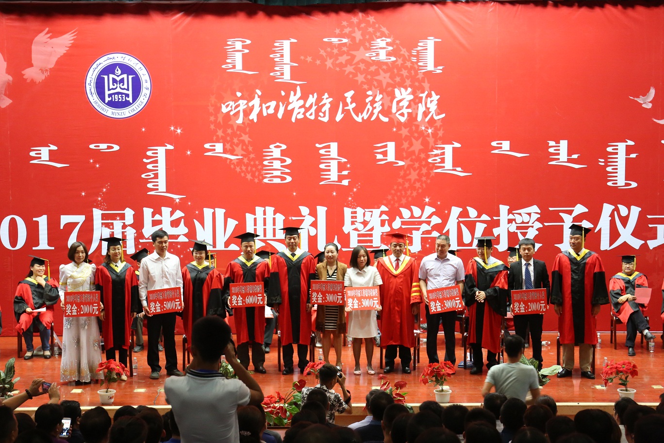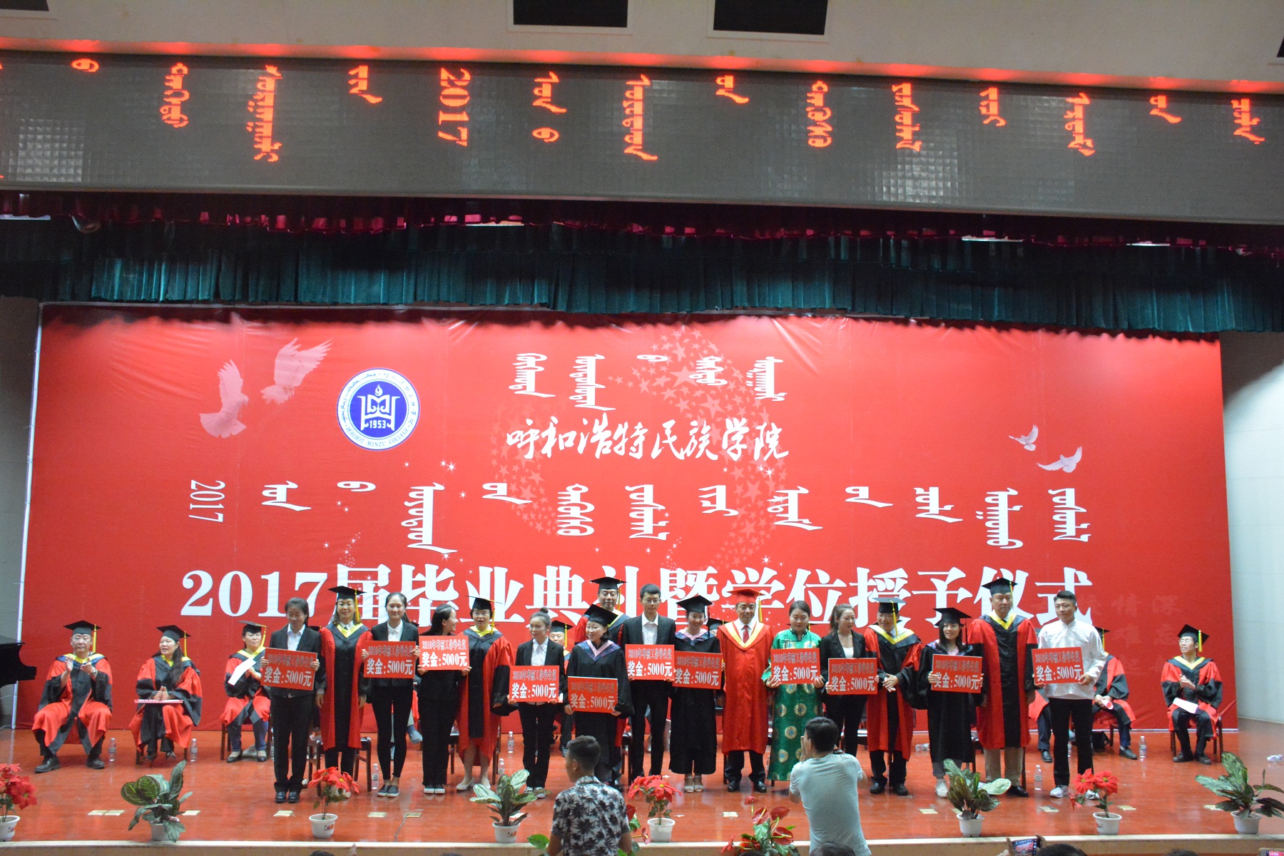 阿拉坦倉副院長宣讀了《呼和浩特民族學院關于對2016年考研工作先進集體和個人進行表彰的決定》;賀希格吉雅副院長宣讀了《關于呼和浩特民族學院“烏蘭夫獎學金”的表彰決定》;學生處楊福梅處長宣讀了獲得國家獎學金、勵志獎學金、自治區“三優”學生名單及《關于表彰2016-2017年度校級“三優”表彰決定》,并由全體校領導向獲獎學生頒發了榮譽證書。