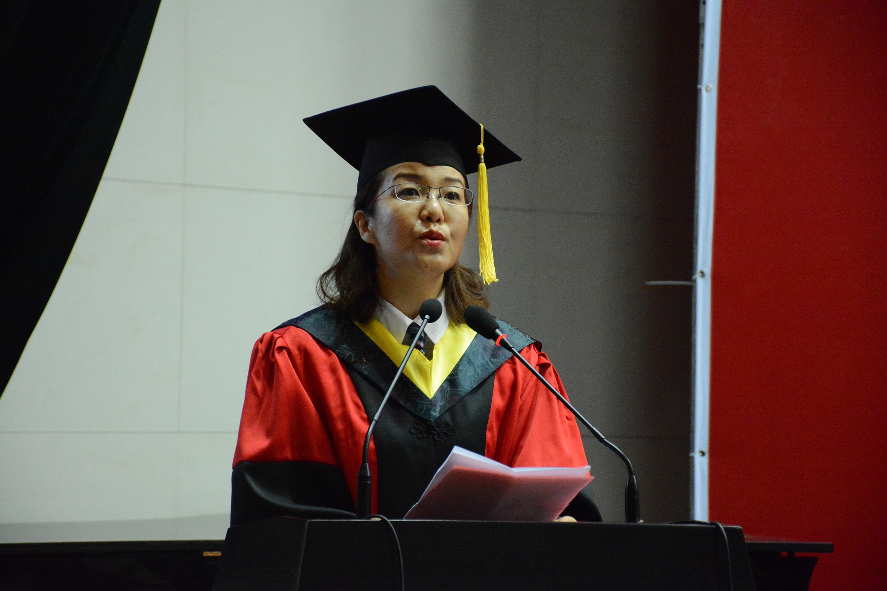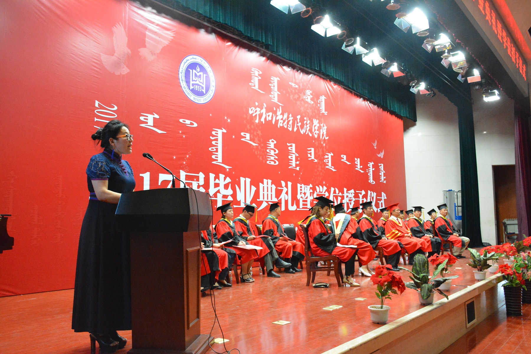 又是一年畢業季,2017年6月26日上午,我校2017屆畢業生畢業典禮暨學士學位授予儀式在圖書館二樓報告廳隆重舉行。學校黨委書記孫國權,黨委副書記、院長格日樂圖,黨委副書記胡春梅,副院長阿拉坦倉,副院長賀希格吉雅,副院長納麗娜,學校學位委員會成員、各系部、各職能部門負責人,以及班主任、輔導員、教師代表、畢業生代表近750人參加了畢業典禮。畢業典禮由納麗娜副院長主持。