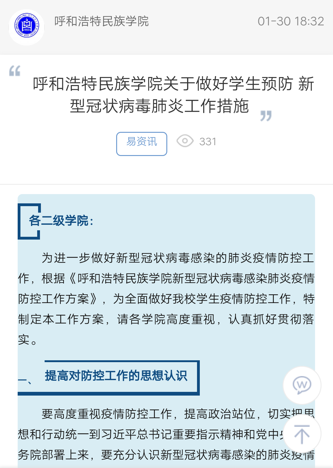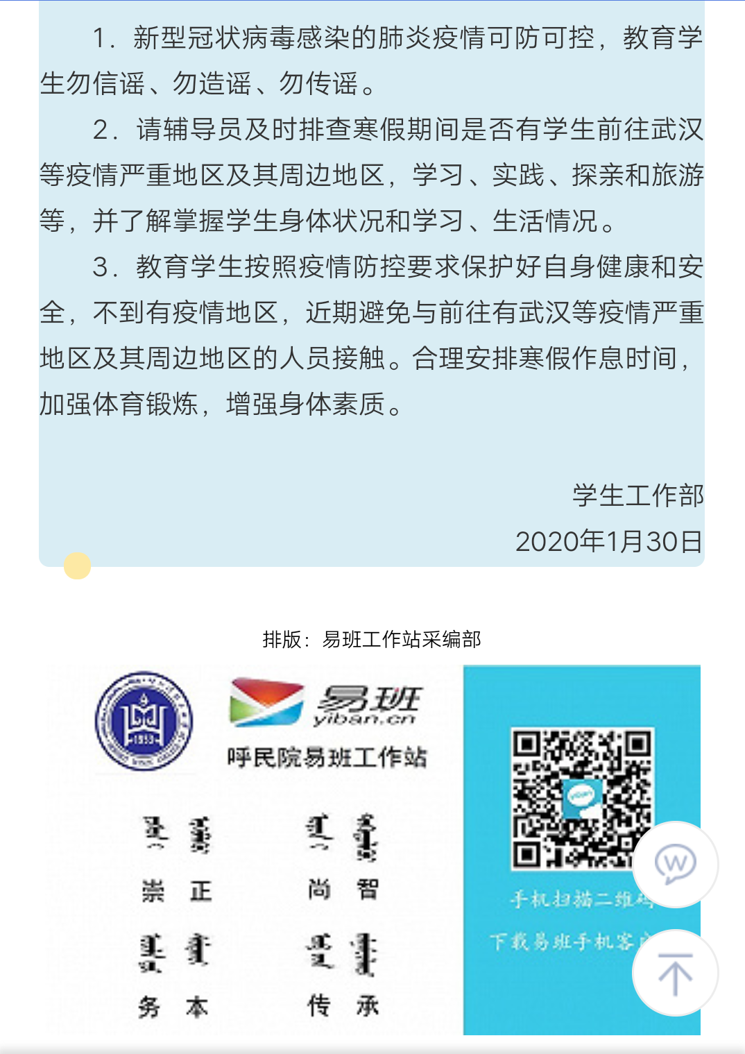 呼和浩特民族學院關于做好學生預防 新型冠狀病毒肺炎工作措施