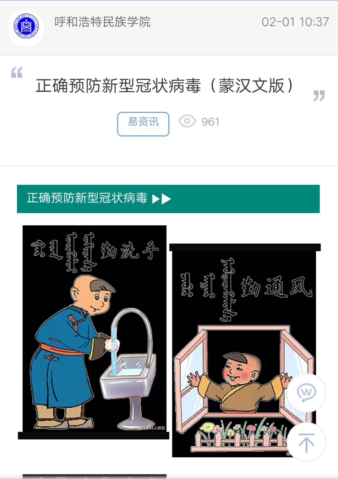 上一條:呼和民院-防疫公開(kāi)課全新上線 下一條:蒙文版來(lái)了!致呼和浩特民族學(xué)院全體師生的一封信