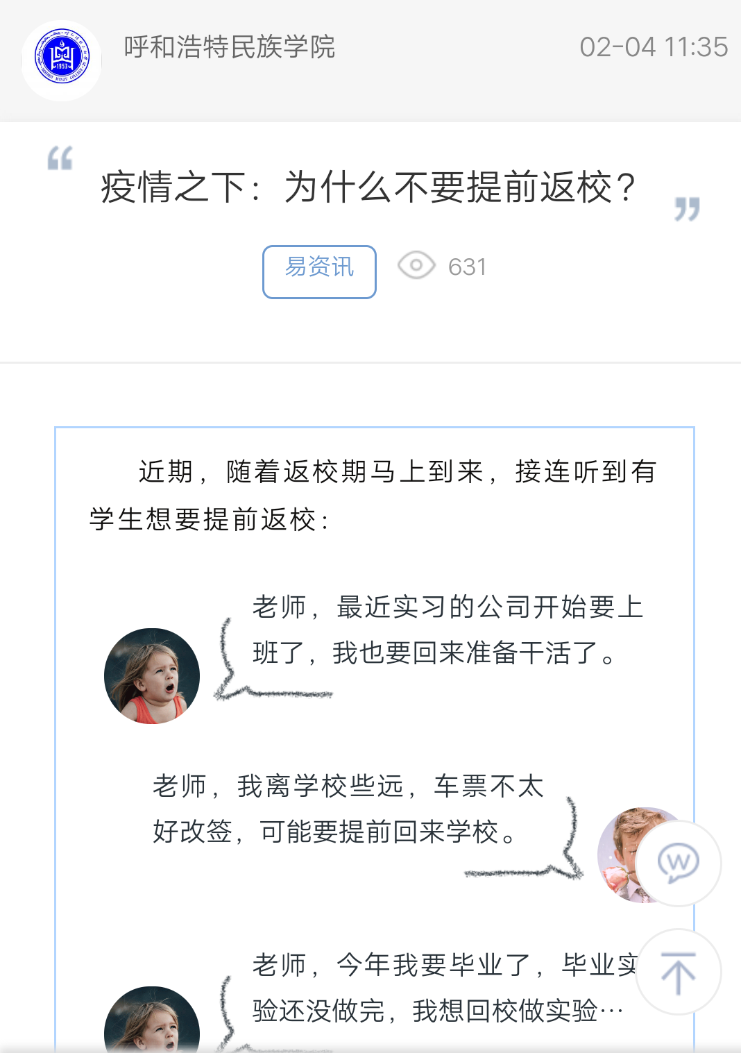 上一條:呼和浩特民族學院 應對新型冠狀病毒肺炎疫情心理援助計劃 下一條:這周是防控重點!