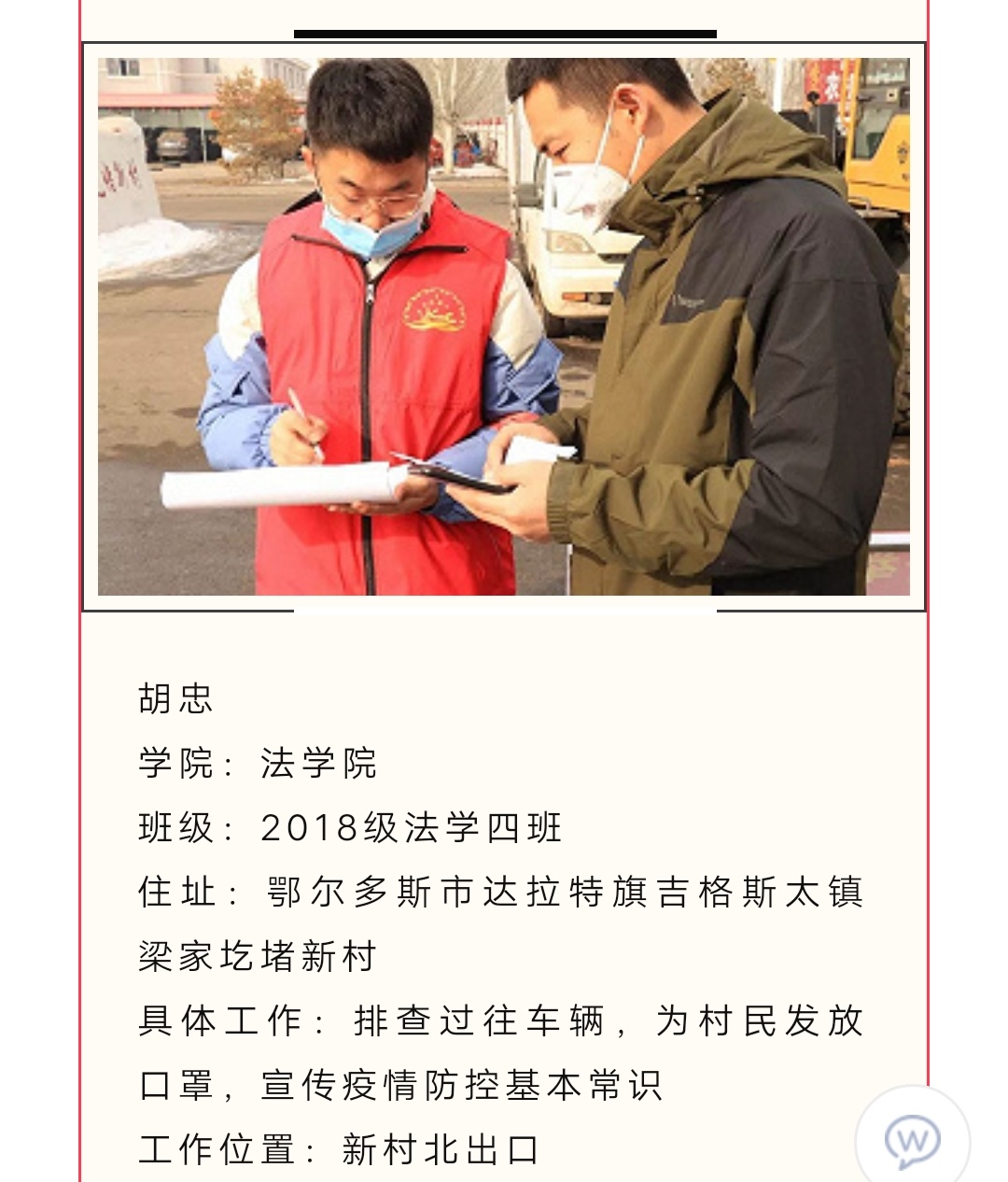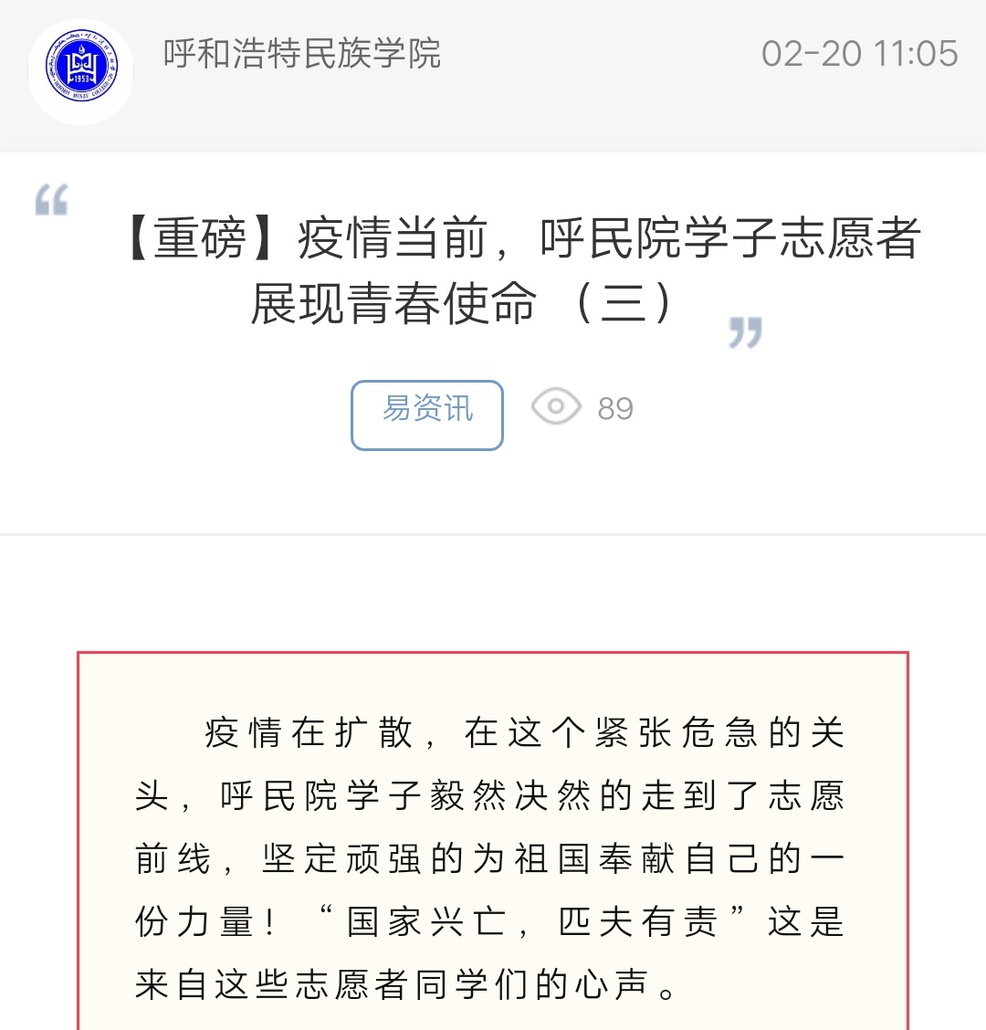 上一條:關于舉辦內蒙古自治區2020年“新途徑杯”網絡簡歷設計大賽呼和民院選拔賽的通知 下一條:【重磅】疫情當前,呼民院學子志愿者展現青春使命 (二)