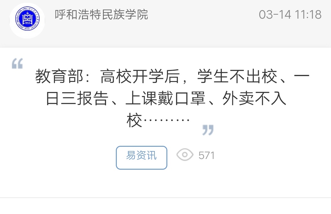 教育部:高校開學后,學生不出校、一日三報告、上課戴口罩、外賣不入校………