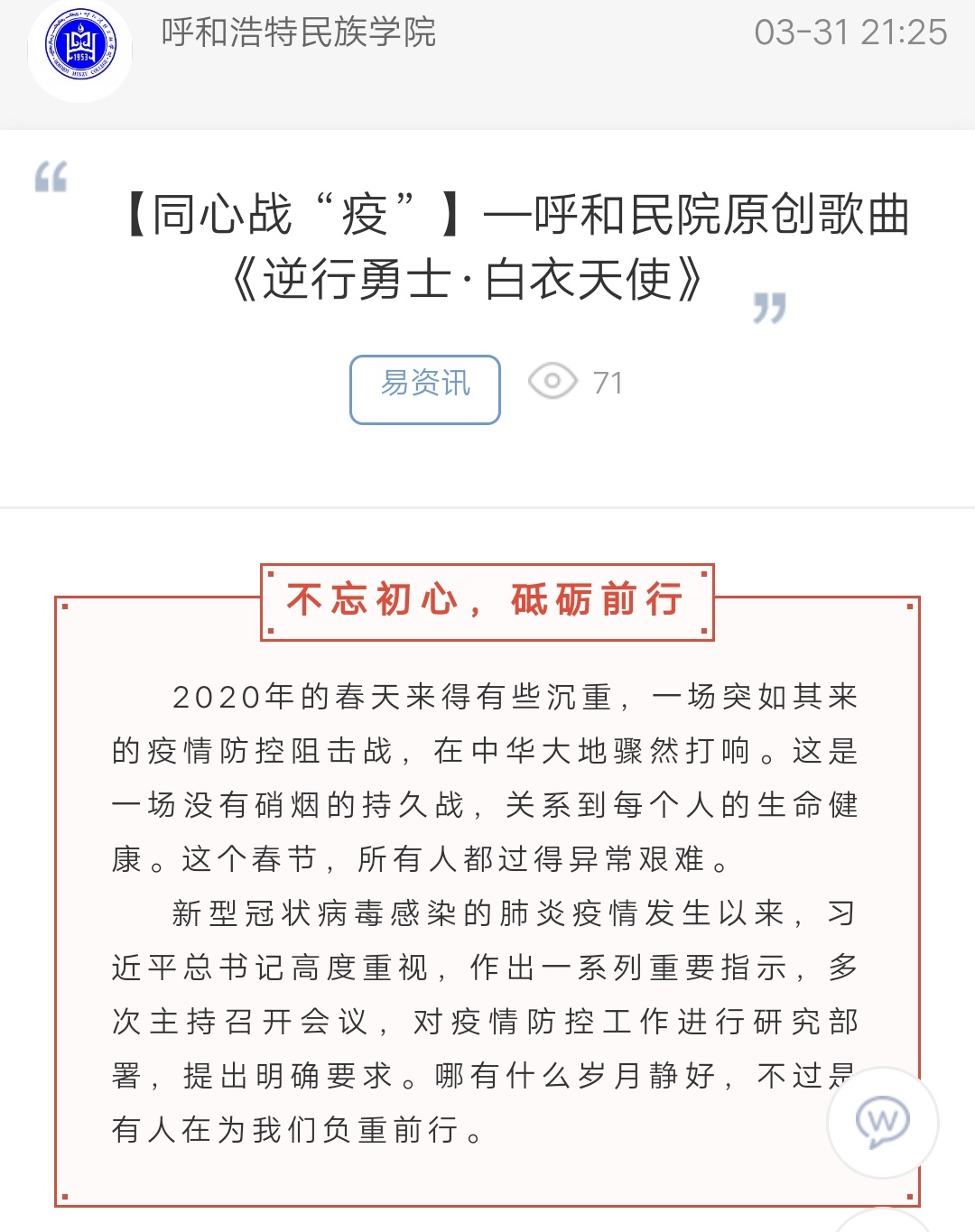 【同心戰“疫”】—呼和民院原創歌曲《逆行勇士·白衣天使》
