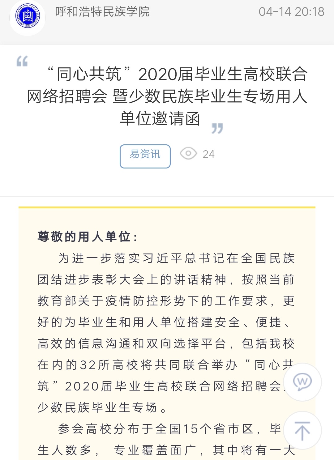 上一條:呼和浩特民族學院“一院一場”2020屆畢業生空中專場招聘會進行時 下一條:學生工作部組織全體輔導員參加全國高校輔導員網絡培訓示范班第三期直播答疑活動