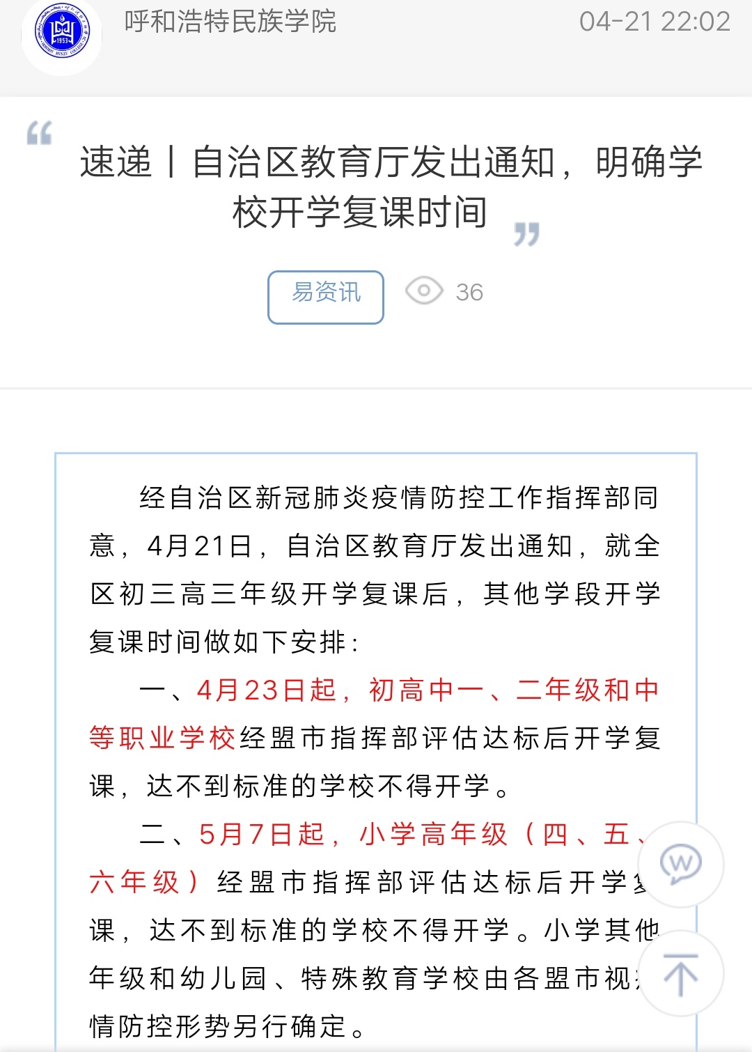 上一條:@民院學子|關于教育廳發布高校開學復課通知后的溫馨提示 下一條:重磅!高校公布擴招規模,博士將達10萬人……