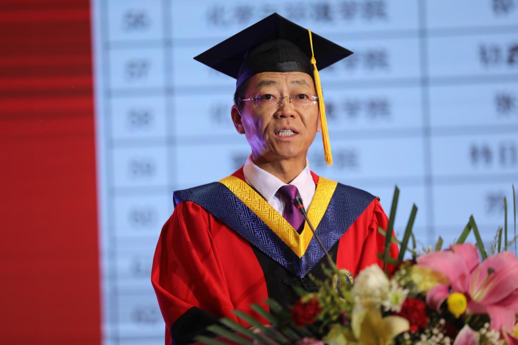 韓偉新在致辭中代表學校向圓滿完成學業,即將踏上人生新征程的2023屆全體畢業生表示熱烈的祝賀,向悉心培育同學們的老師和家長致以衷心的感謝。他勉勵同學們一要厚植愛國情懷,堅定信念、志存高遠,做新時代民族復興中勇往直前的筑夢人;二要錘煉實干之勇,腳踏實地、艱苦奮斗,做中國式現代化勇毅前行的建設者;三要擔當團結之責,愛我中華、守望相助,做鑄牢中華民族共同體意識的“播種者”和推動者。并祝愿所有畢業生此去繁花似錦,歸來仍是少年!