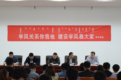 2017年4月13日17時,美術系在四樓階梯教室召開了學風建設動員大會。學生管理處副處長包倉、美術系黨總支書記國慶、美術系副主任高特木樂、美術系團總支書記白永泉出席會議。會議由美術系黨總支副書記包旭東主持,美術系全體班主任及學生代表200多人參加了本次大會。