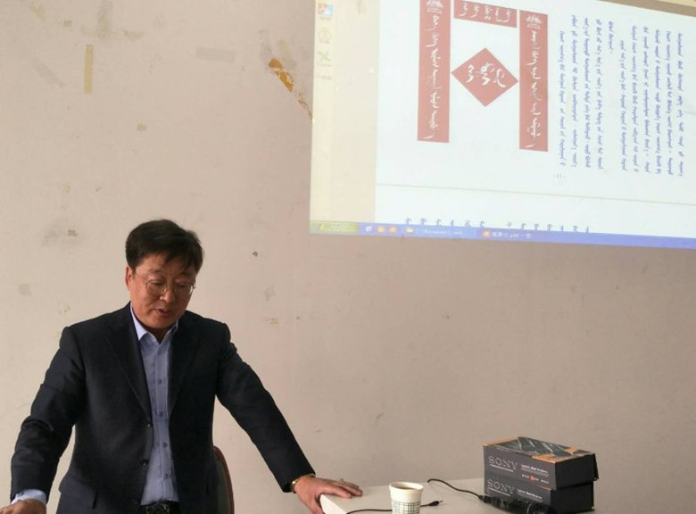 3月29日下午14時30分,蒙古語言文學系邀請中國社會科學院民族學與人類學研究所研究員、民族文字文獻研究室主任、博士生導師曹道巴特爾博士作題目為《十九世紀蒙古文對聯文獻<對子匯集>及其價值》的專題學術報告。講座由蒙古語言文學系副主任蘇布道教授主持,蒙古語言文學系師生約100余人參加。