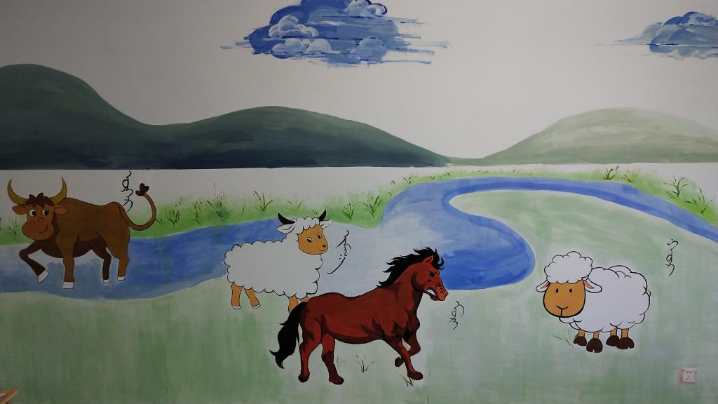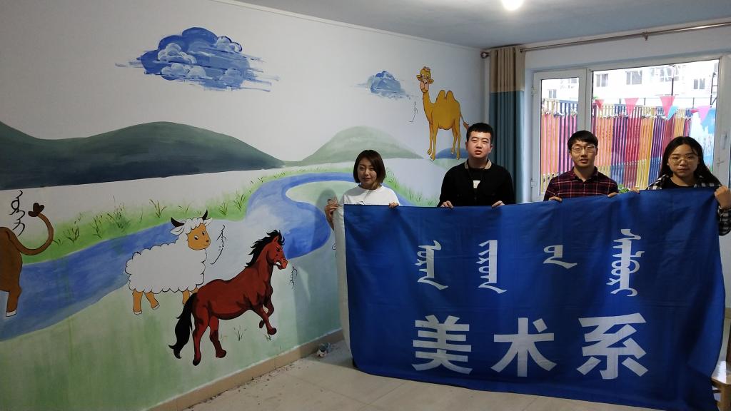 本次活動充分發(fā)揮了美術系學生的專業(yè)特長,同學們?yōu)檫@所幼兒園墻體描繪出民族文化特色的圖案,從孩子的視野角度出發(fā),在墻面上生動描繪了內蒙古地區(qū)的民族特色風貌以及草原上生活的動物,使從小生活在城市里的蒙古族小朋友能夠感受到草原的風貌,為孩子的心中種下民族團結的種子。