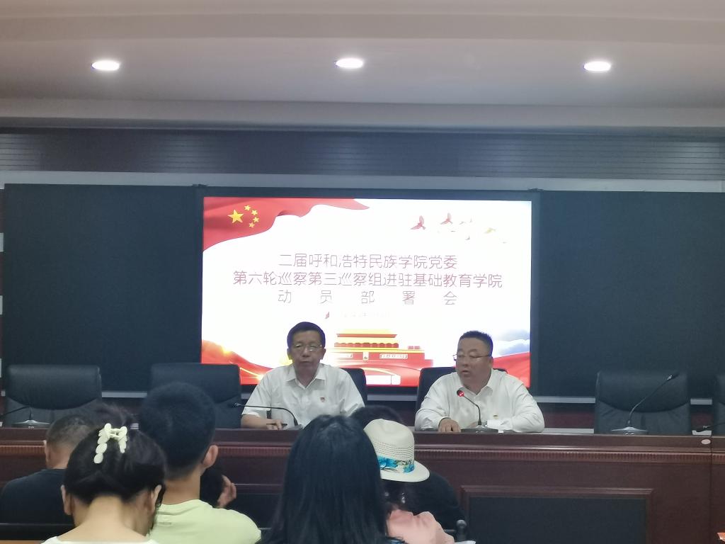 根據學校黨委統一安排部署,7月3日下午,二屆呼和浩特民族學院黨委第六輪巡察第三巡察組進駐基礎教育學院動員部署會在尚智樓413室召開。第三巡察組全體人員、學院領導班子成員、全體教職工及部分學生代表近60人參加會議,會議由學院黨總支書記常喜主持。