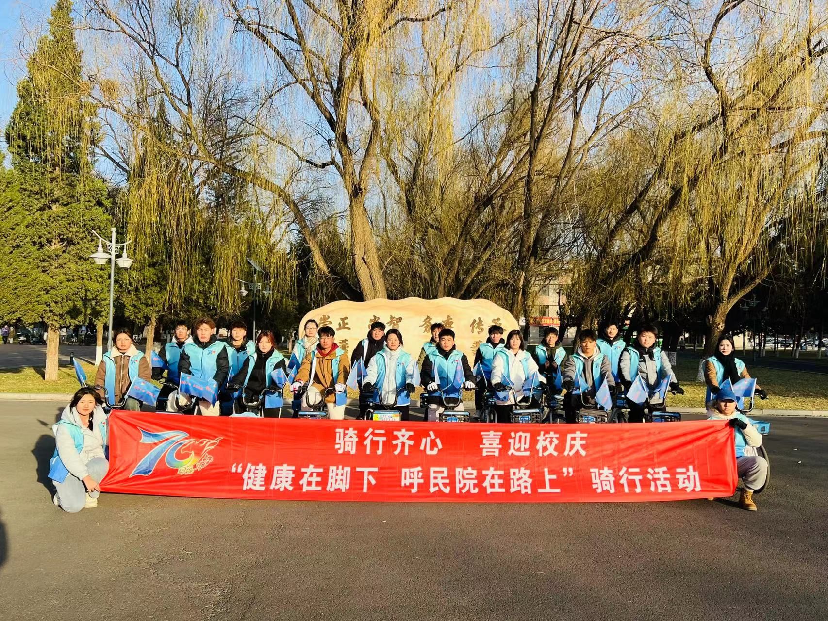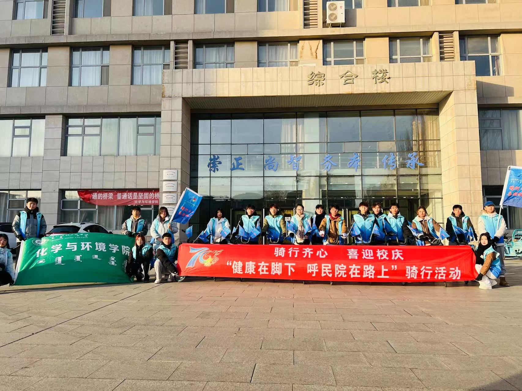 為喜迎70周年校慶,營(yíng)造良好校慶氛圍,激發(fā)同學(xué)們的愛(ài)校熱情,11月25日,化學(xué)與環(huán)境學(xué)院組織30余名學(xué)生干部開(kāi)展“騎行齊心 喜迎校慶——健康在腳下 呼民院在路上”校慶主題騎行活動(dòng)。
