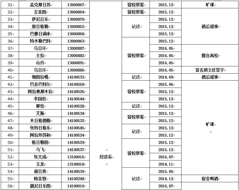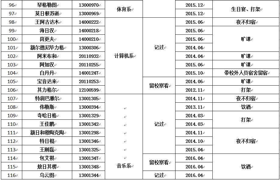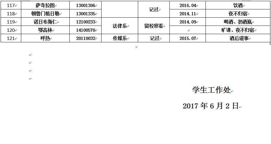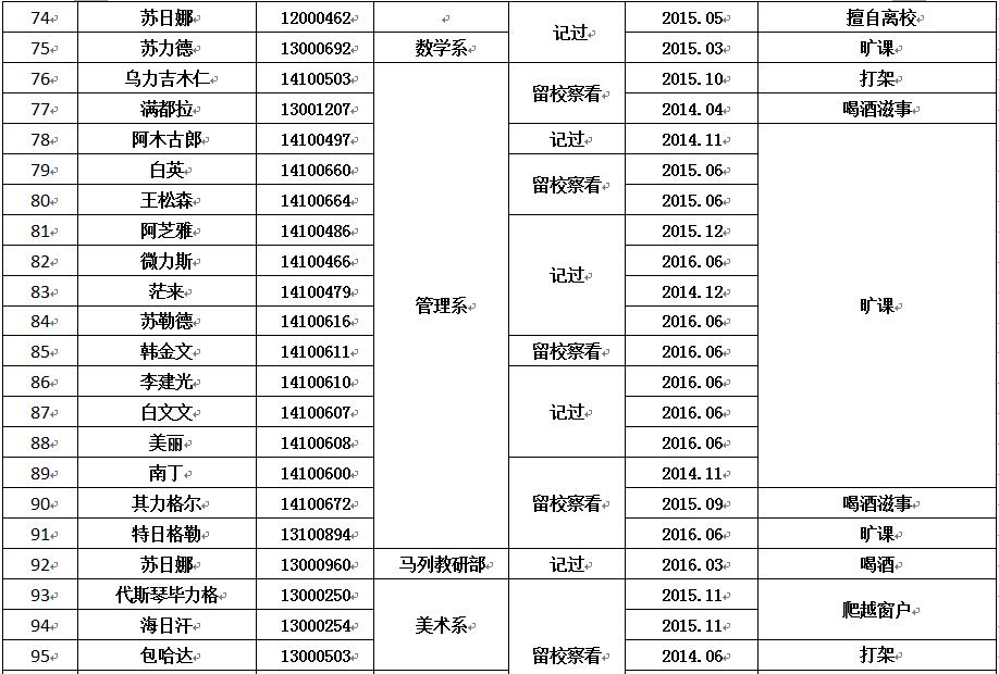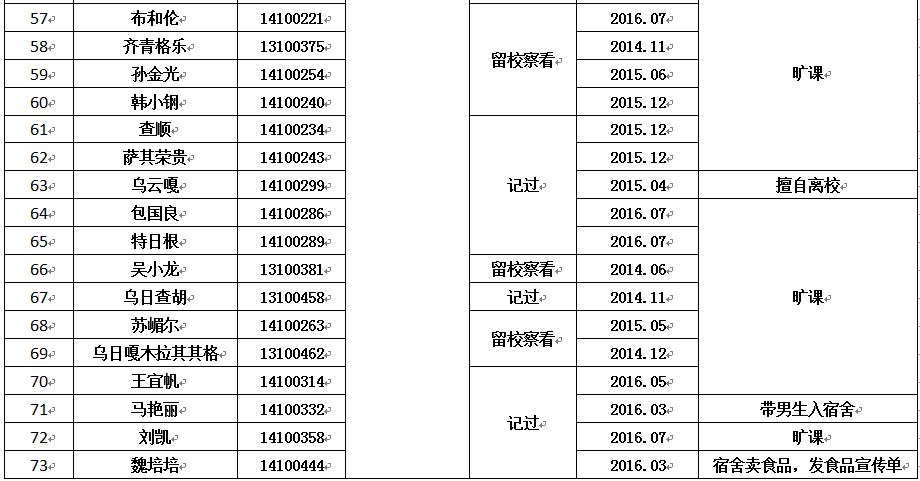 根據《呼和浩特民族學院學生違紀處分條例》第三十條、三十一條規定,經學生本人申請,所屬系(部)班主任、系(部)學生工作領導小組評議審查,學生工作處召開處務會議研究決定,對符合撤銷處分條件的寶小軍等121名應、往屆學業生給予撤消處分的決定。具體名單如下: