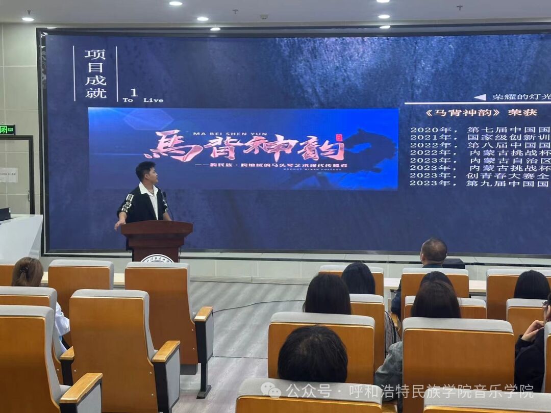 分享會邀請到第九屆中國國際“互聯網+”大學生創新創業大賽金獎獲得者——音樂學院“馬背神韻——跨民族、跨地域的馬頭琴藝術現代傳承者”項目團隊作經驗分享。