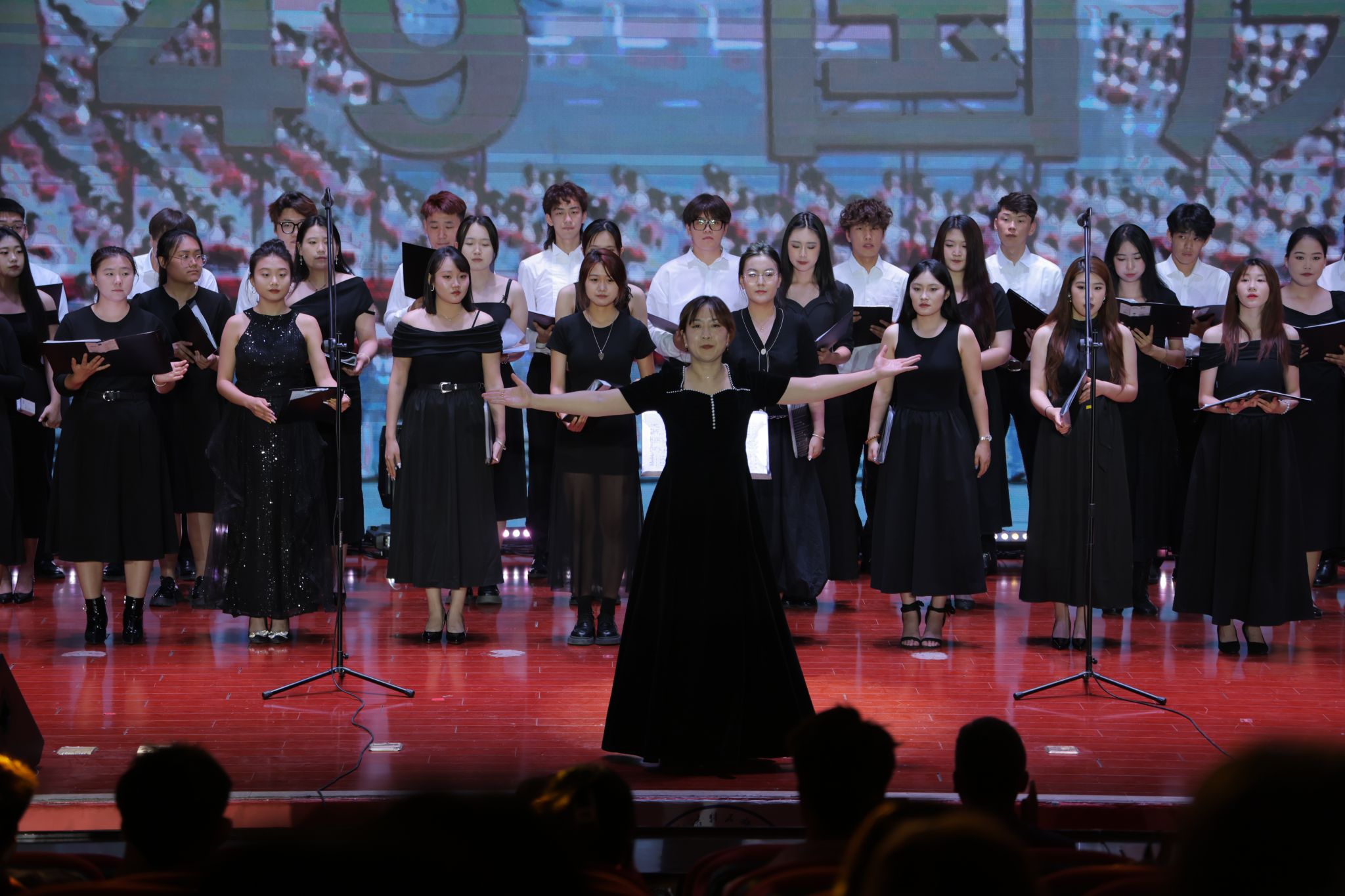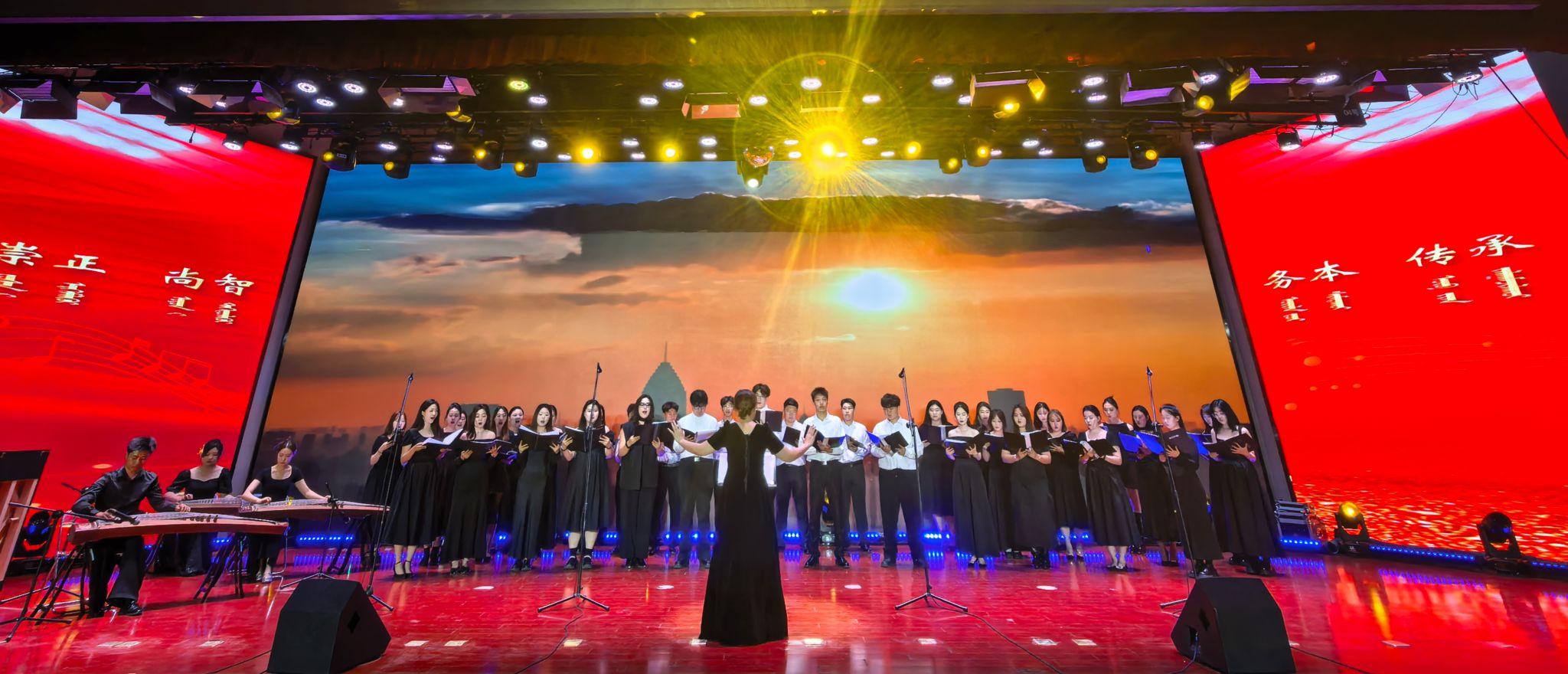 為檢驗教學成果、提升學生舞臺素養。2025年6月25日晚,音樂與舞蹈學院在學校鑄牢教育館二樓報告廳舉辦“北疆教育心向黨·文化使命藝擔當”主題《合唱》與《舞臺實踐》課程實踐演出。學校各部門、各學院師生代表,音樂與舞蹈學院全體師生觀看演出,課程指導教師兼指揮張麗陽帶領2022—2024級音樂學、音樂表演專業百余名學生集中展示了課程教學的創新成果。