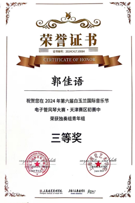 6月8日,2024第六屆白玉蘭國際音樂節電子鍵盤樂器(電子管風琴)大賽在天津市青年宮成功舉辦。我校音樂學院雙排鍵專業學生武一諾在天津賽區初賽中榮獲考級作品組(十級)一等獎、學生郭佳語榮獲獨奏青年(18周歲及以上)組三等獎的優異成績,并均闖入全國決賽。